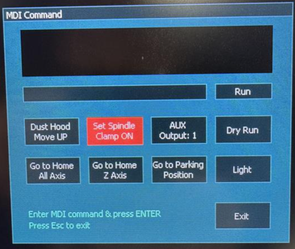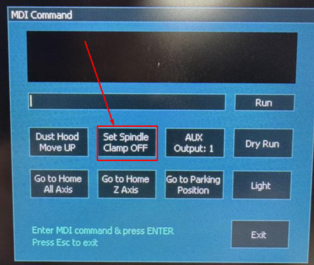 Return to the F2/Program&MDI screen and tap the red "Set Spindle Clamp ON" button again to turn it off.