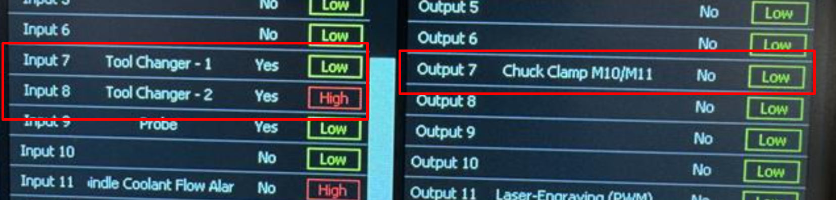 - Chuck Clamp (Output 7) goes HIGH to unclamp the tool